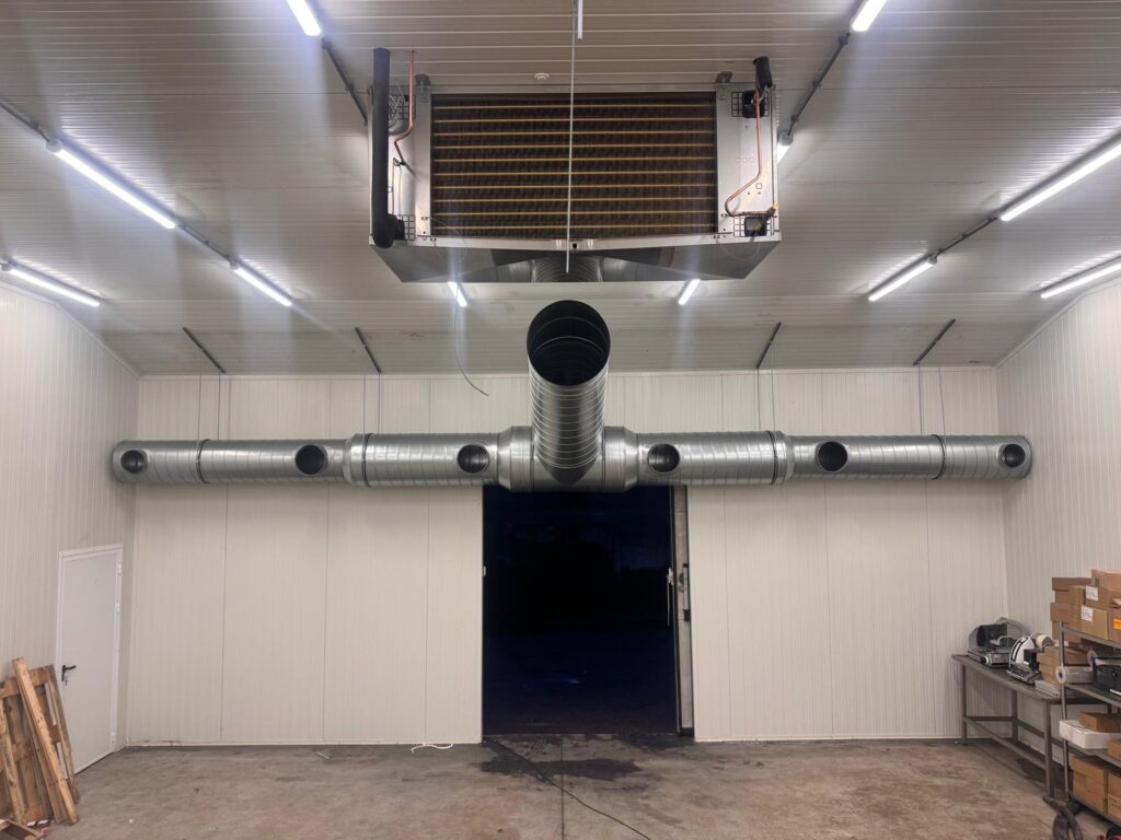 Voor een bestaande klant hebben wij een compleet nieuwe ruimte voor kaasopslag ontworpen, uitgewerkt én volledig geleverd en gemonteerd. De installatie is volledig afgestemd op de wensen van de klant en biedt optimale controle over zowel temperatuur als relatieve vochtigheid (RV) – essentieel voor perfecte kaasrijping en -opslag.